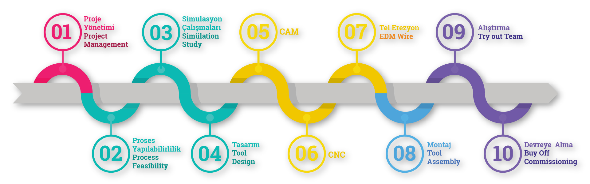 - Alıştırma: 4 kişilik alıştırma geliştirme ekibi, 250 t alıştırma presi ve 600 t deneme presi ile hizmet veriyoruz.